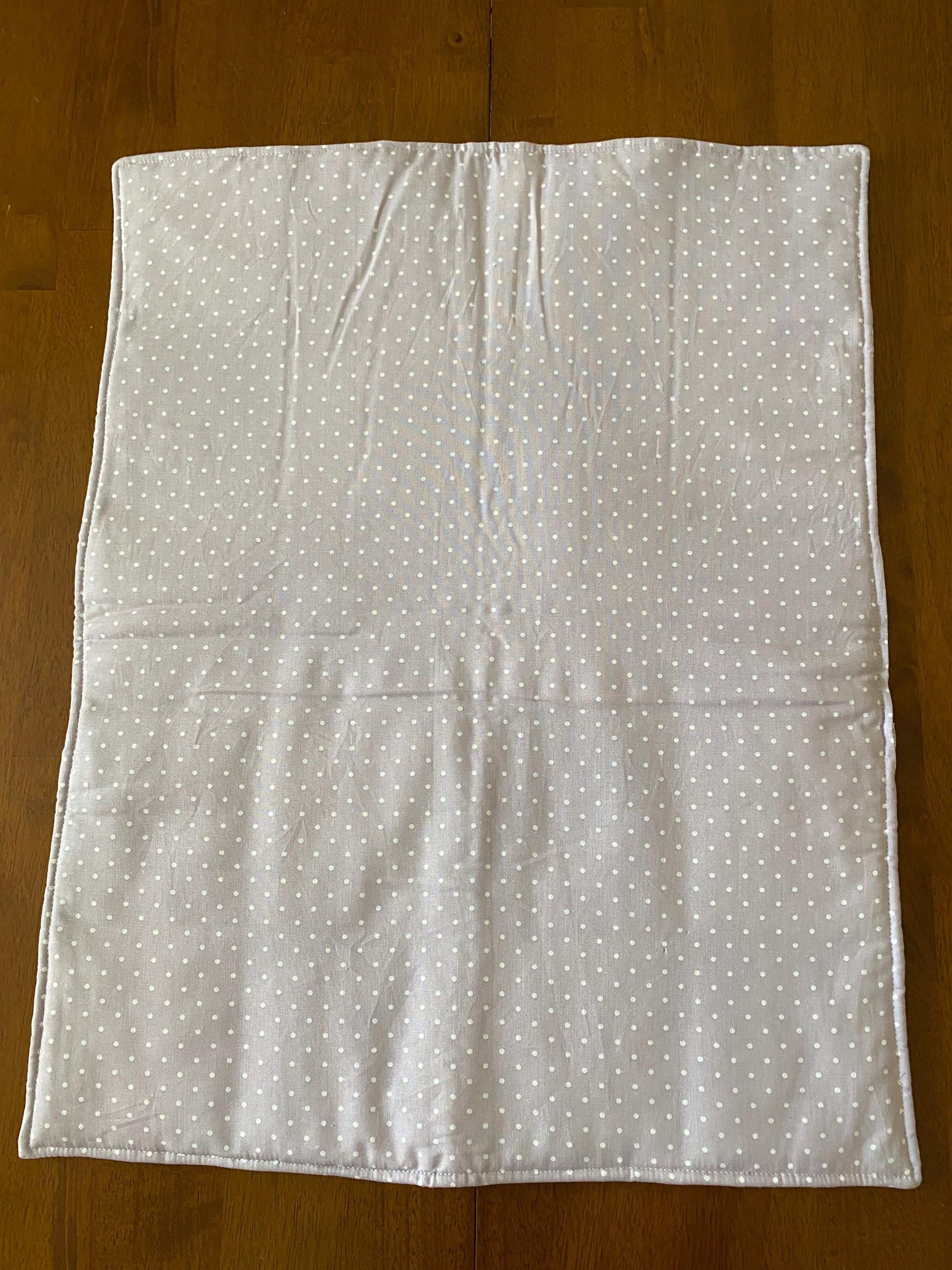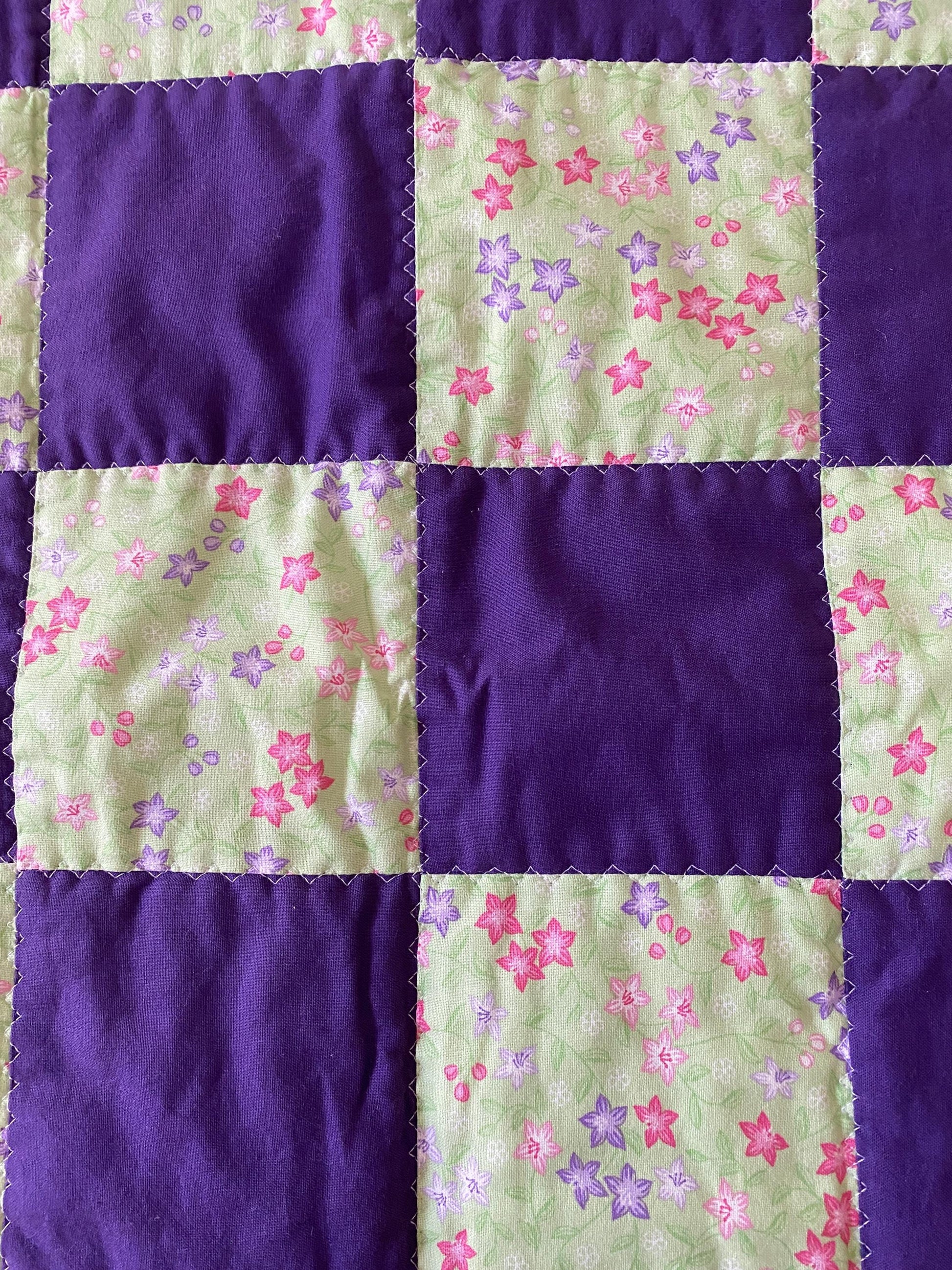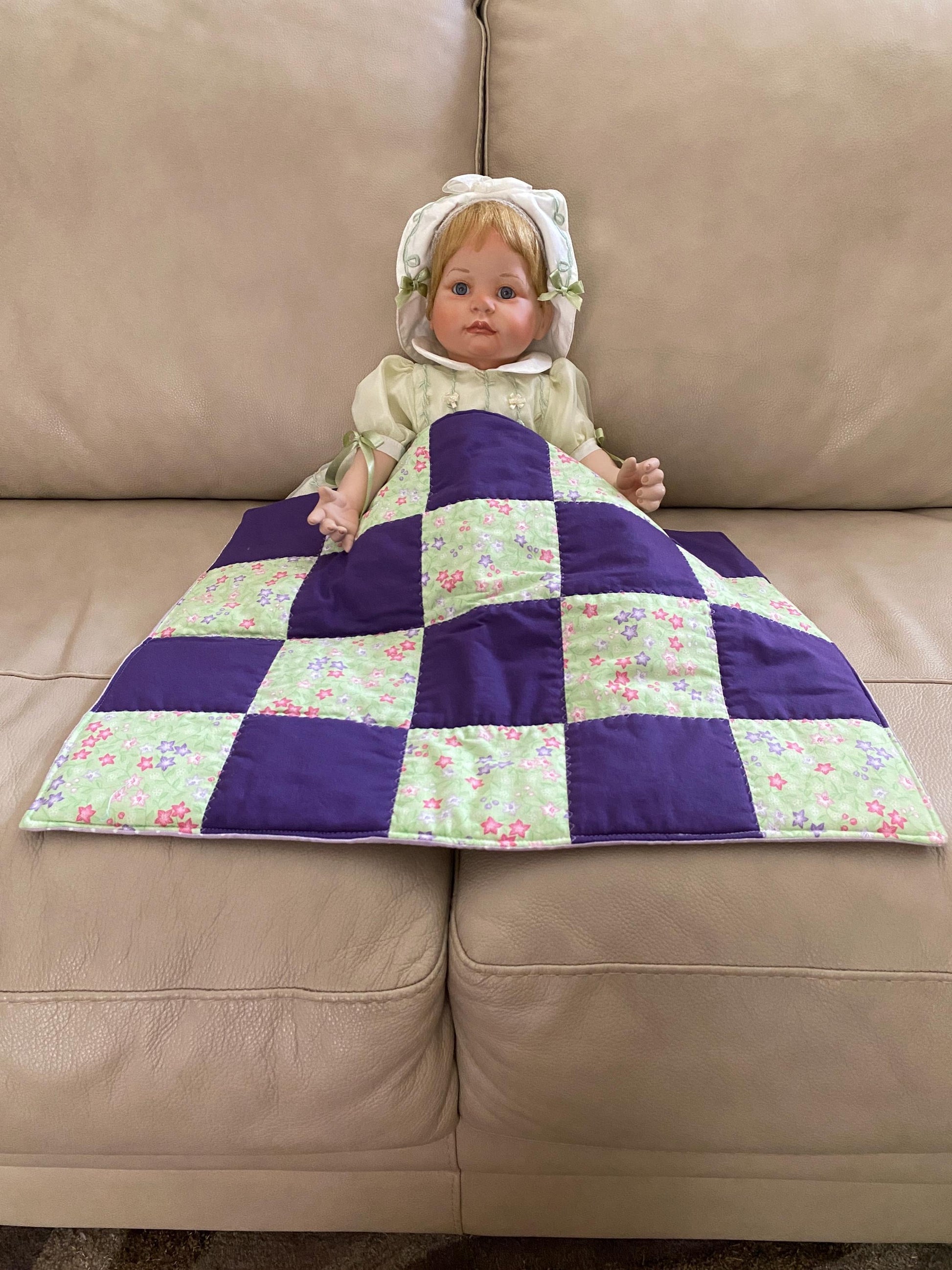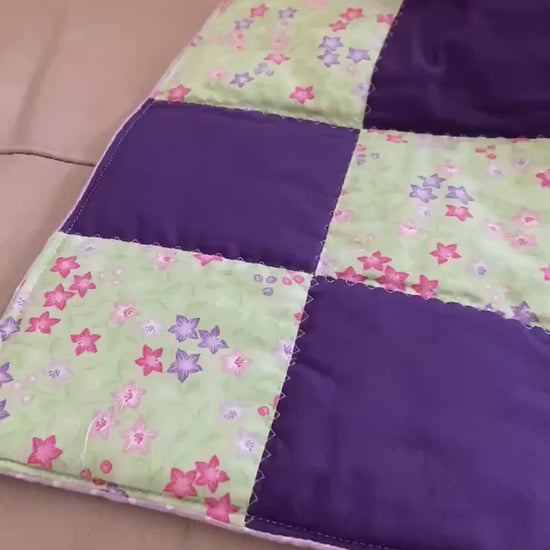 This cute approximate 16”x 21” Handmade Baby Doll Quilted Blanket with Colorful Blocks and Flowers. Back is Purple with White Polka Dots. A great young child's birthday gift. Warm Company batting, then quilted the three layers. Perfect for your child's play doll to snuggle with or playtime on the floor. Use, & Wash over & over! They get softer with every wash!