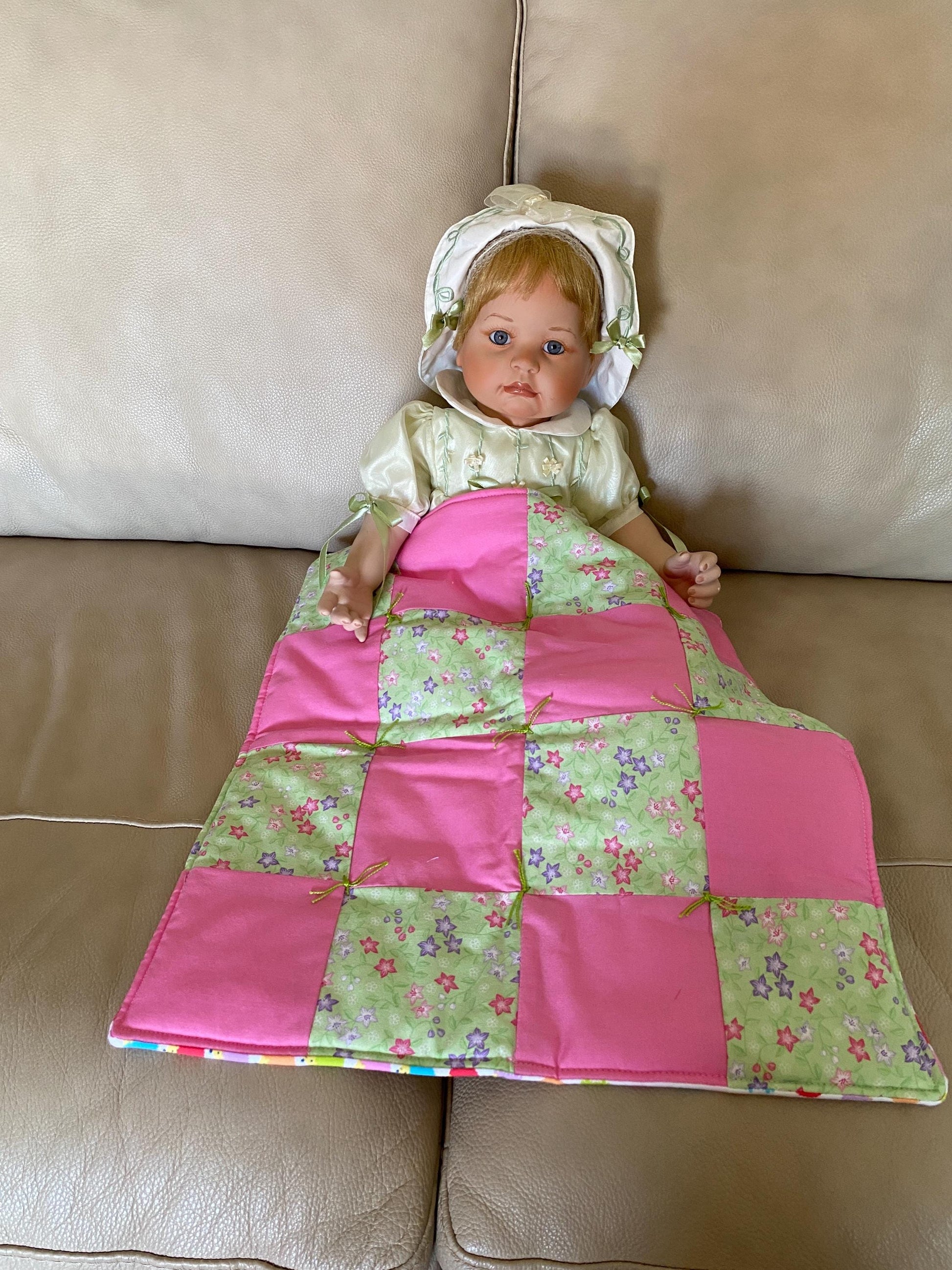 Handmade Baby Doll Quilted Blanket with Colorful Flowers and Pink Blocks