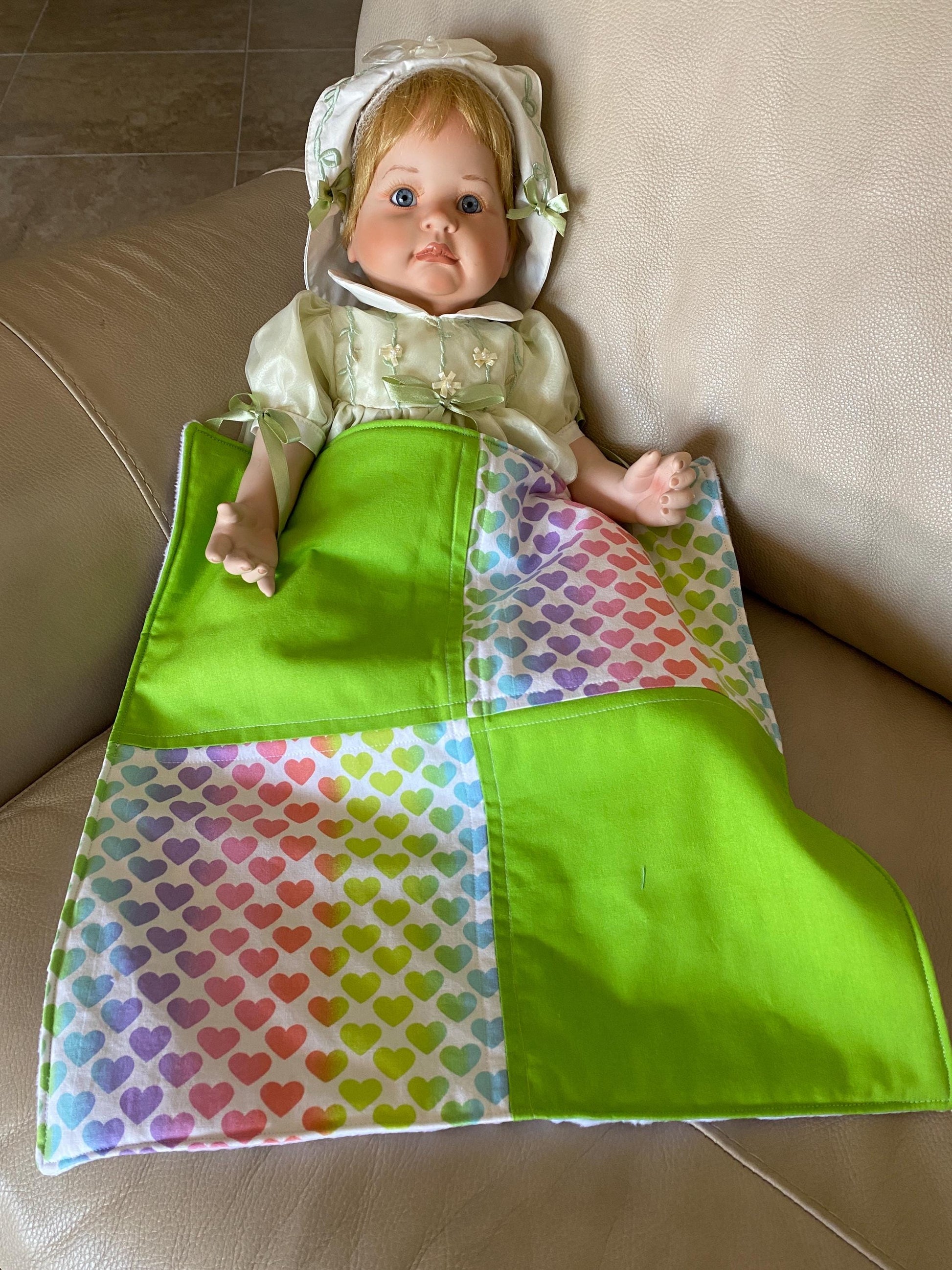 This cute approximate 16”x 16” Handmade Baby Doll Quilted Blanket with Colorful Hearts and Minky Back. The colors are Colorful Hearts and Green blocks. Back is soft white Minky dot fleece. A great young child's birthday gift. Warm Company batting, then quilted the three layers. Perfect for your child's play doll to snuggle with or playtime on the floor. Use, & Wash over & over! They get softer with every wash!