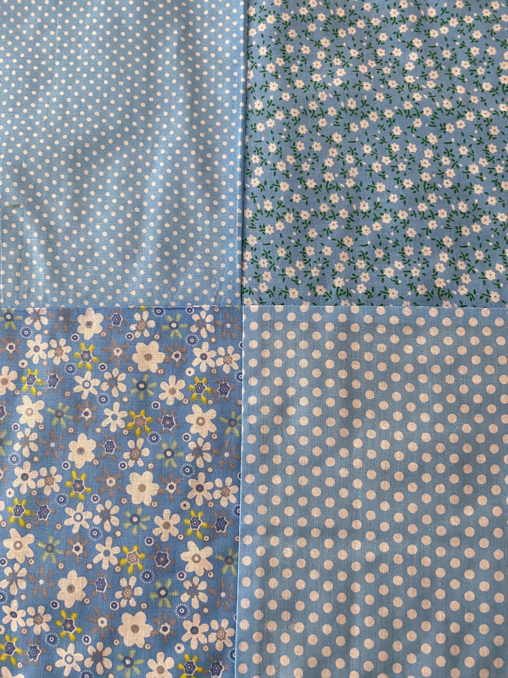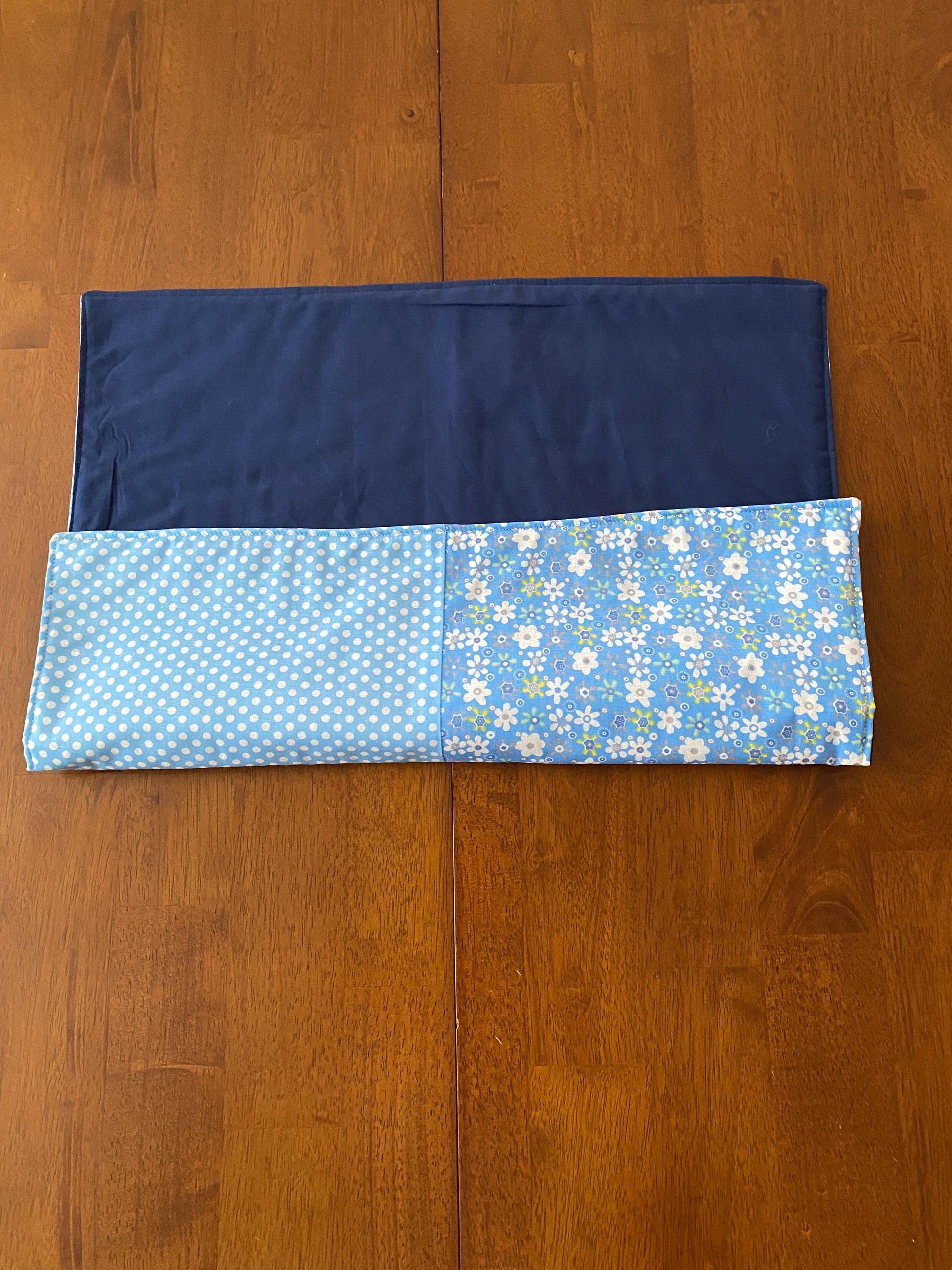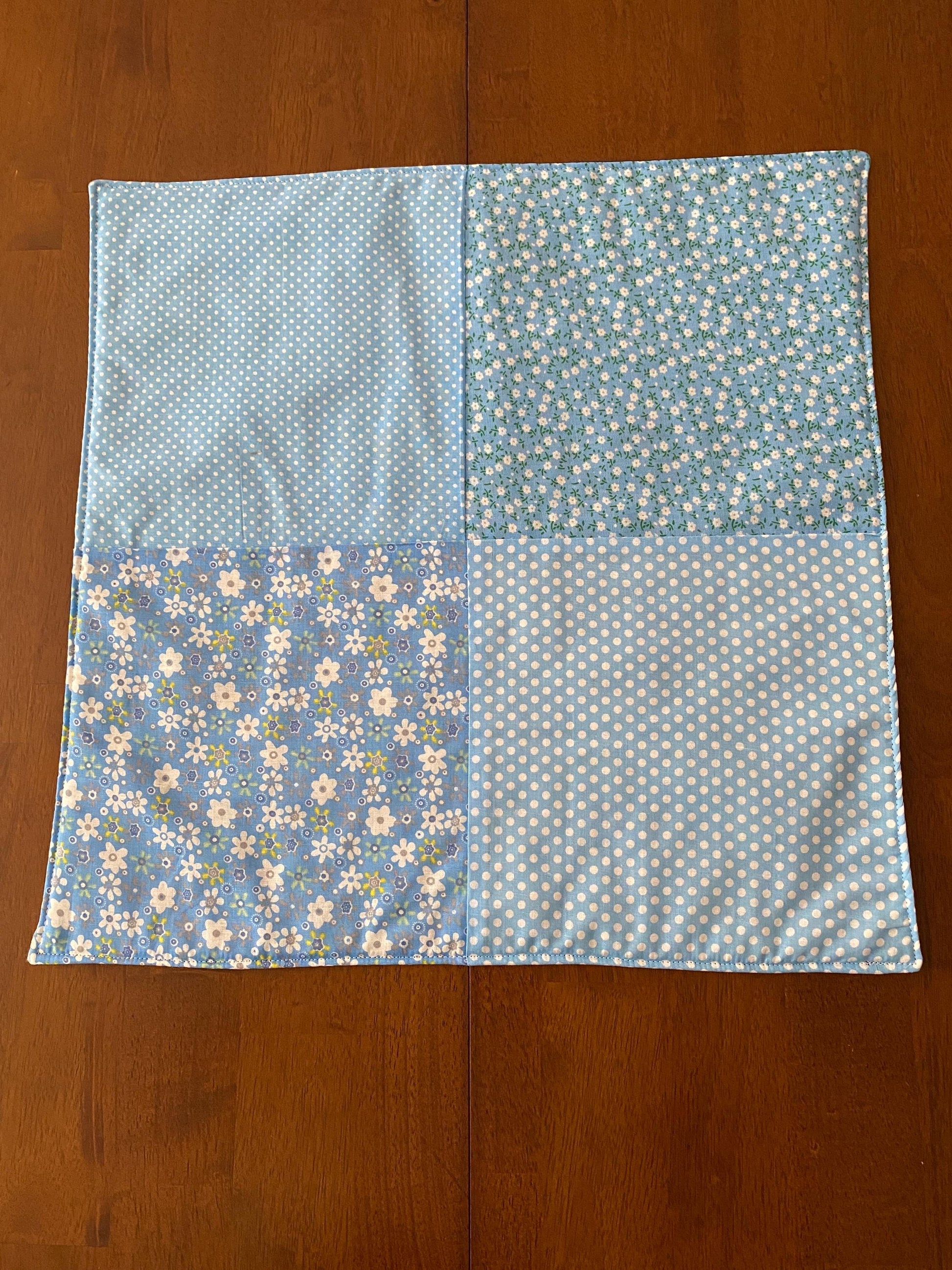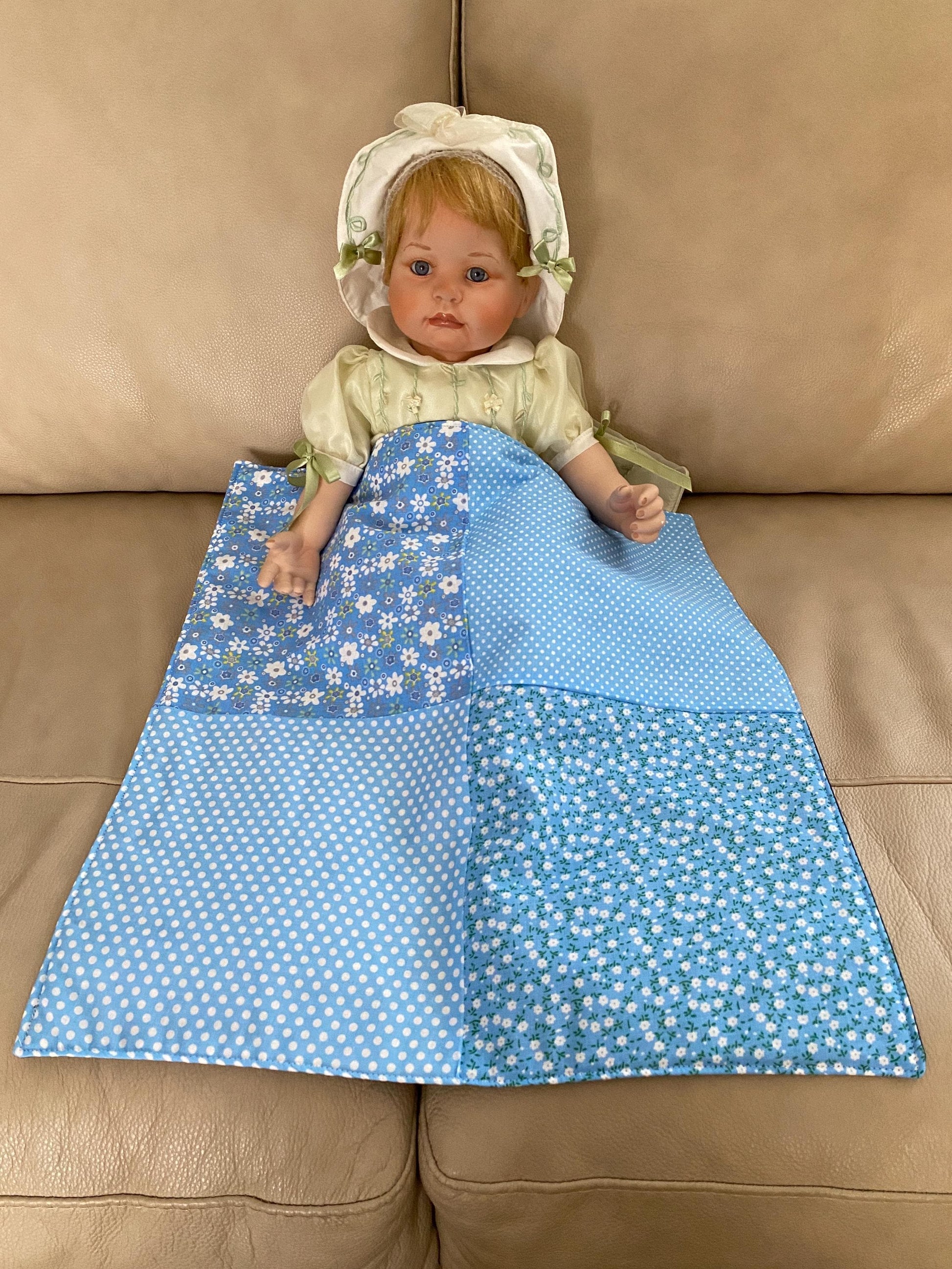 This cute approximate 16”x 16” Handmade Baby Doll Quilted Blanket with Polka Dots and Flower Blocks Light Blue. Back is solid navy material. A great young child's birthday gift. Warm Company batting, then quilted the three layers. Perfect for your child's play doll to snuggle with or playtime on the floor. Use, & Wash over & over! They get softer with every wash!