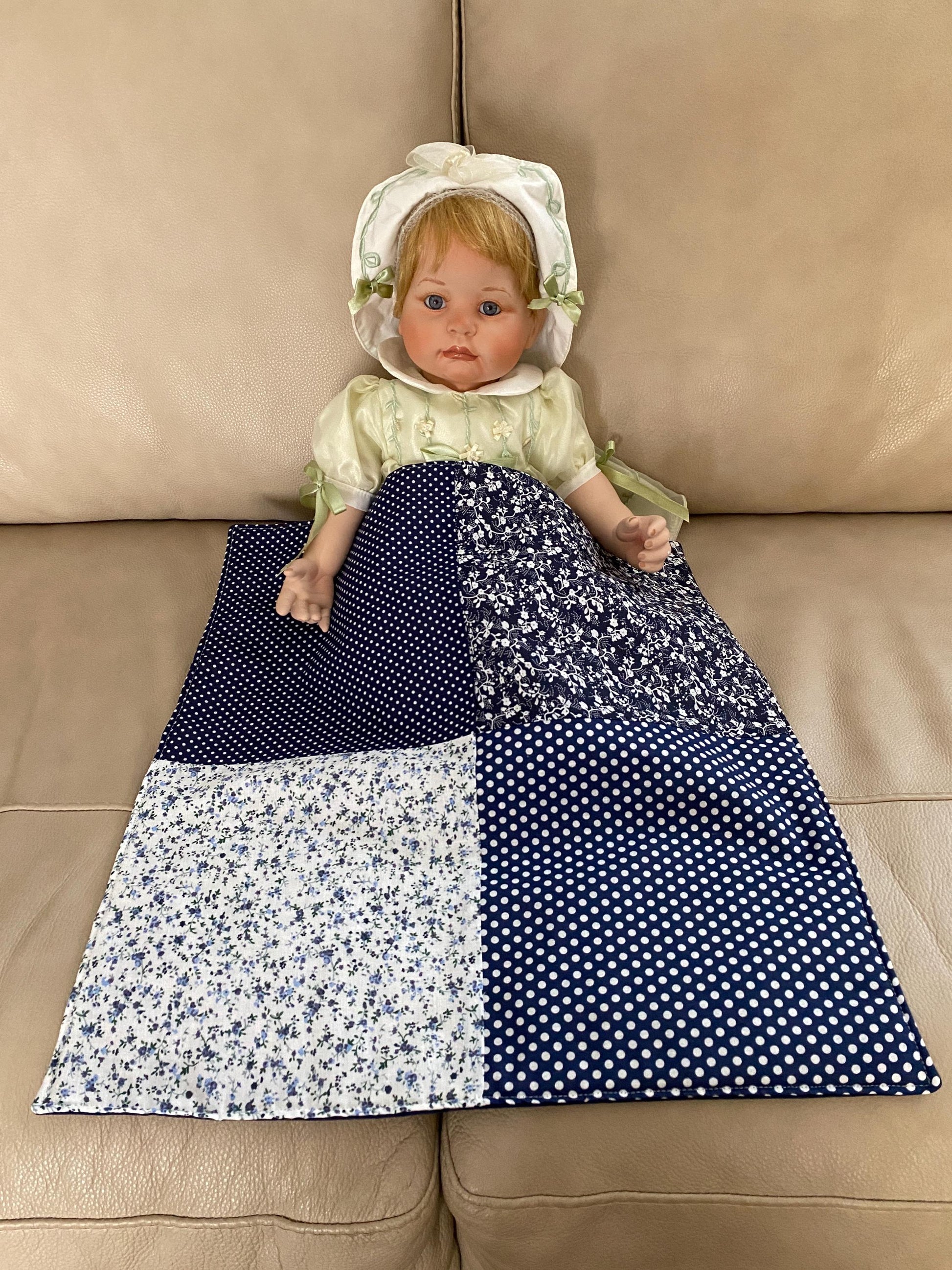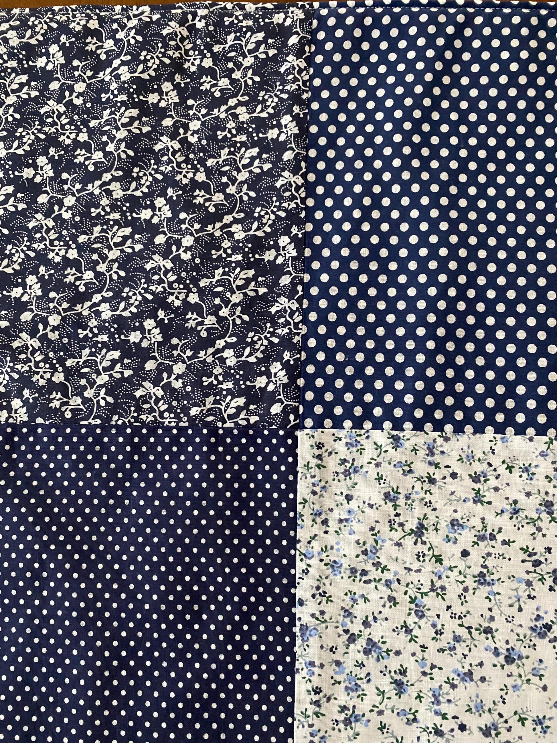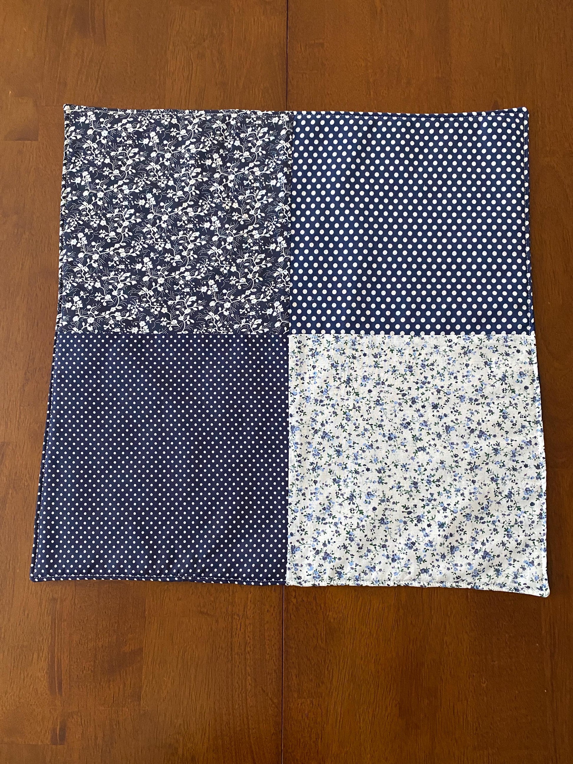 This cute approximate 16”x 16” Handmade Baby Doll Quilted Blanket with Polka Dots and Flower Blocks Navy. Back is solid navy material. A great young child's birthday gift. Warm Company batting, then quilted the three layers. Perfect for your child's play doll to snuggle with or playtime on the floor. Use, & Wash over & over! They get softer with every wash!