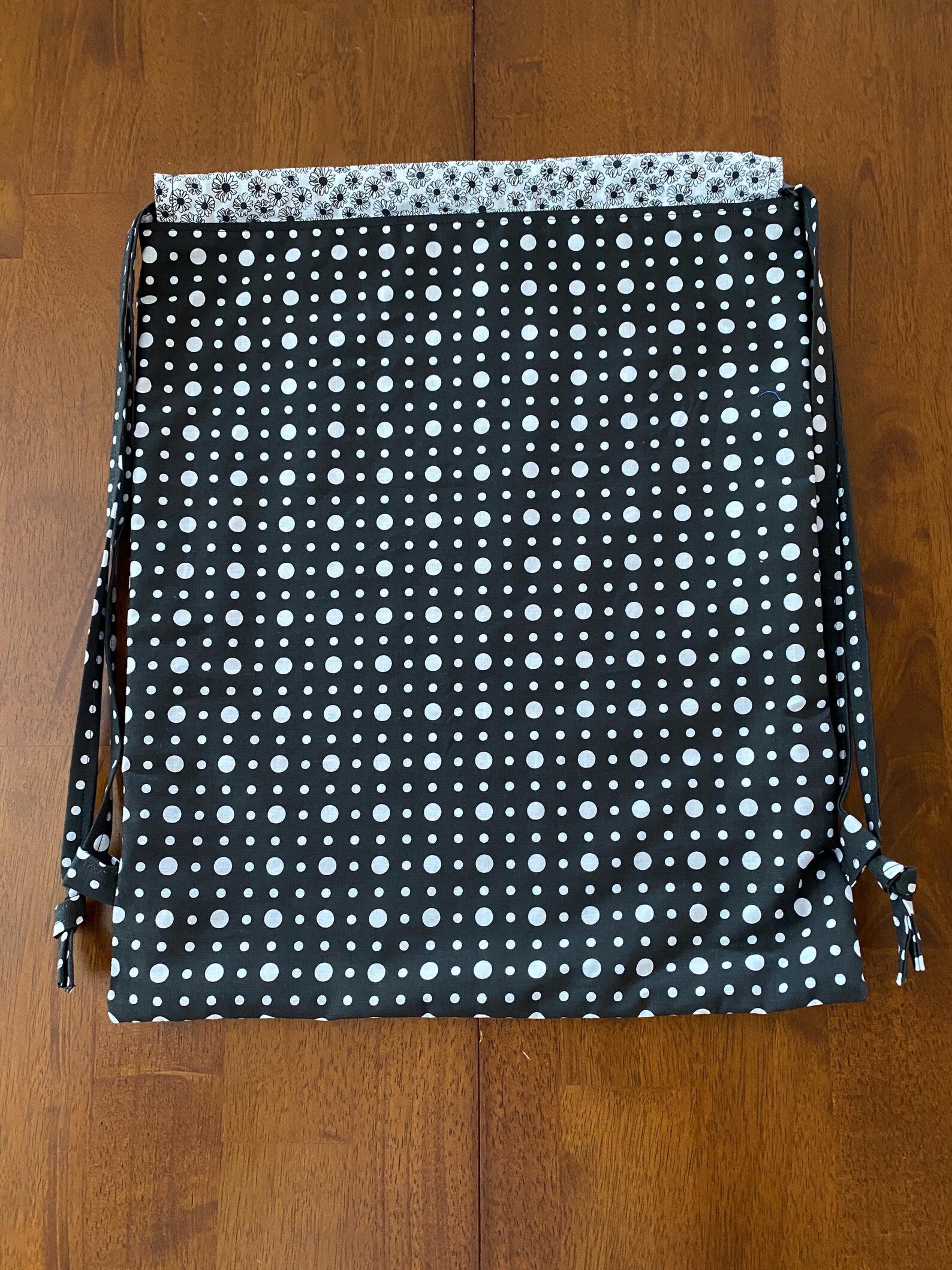 Handmade Lined Child Black and White Dots Backpack With Draw Straps and Black and White Flowers Lining.