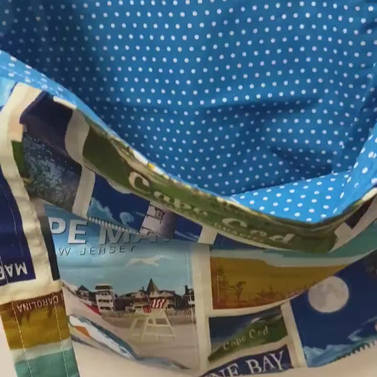 This handmade reversible large tote bag with Lighthouses with a Blue and White Polka Dots lining and are perfect to carry around all your favorite things!