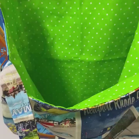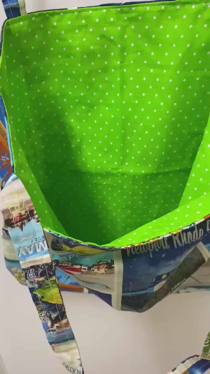 This handmade reversible large tote bag with Lighthouses with a Green and White Polka Dots lining and are perfect to carry around all your favorite things!