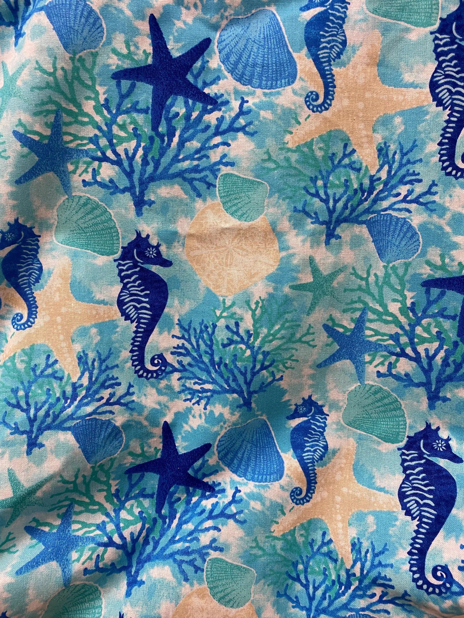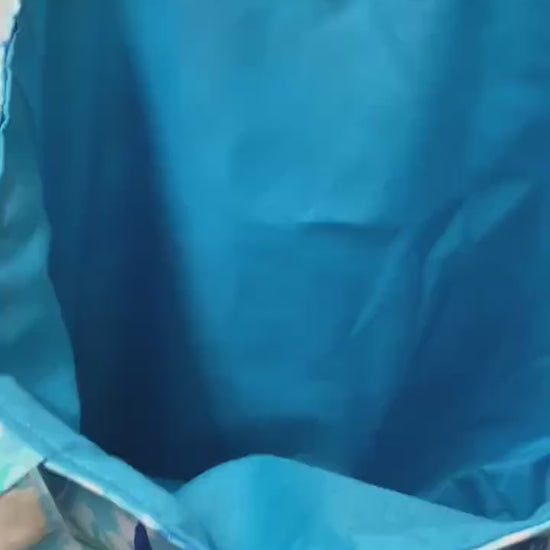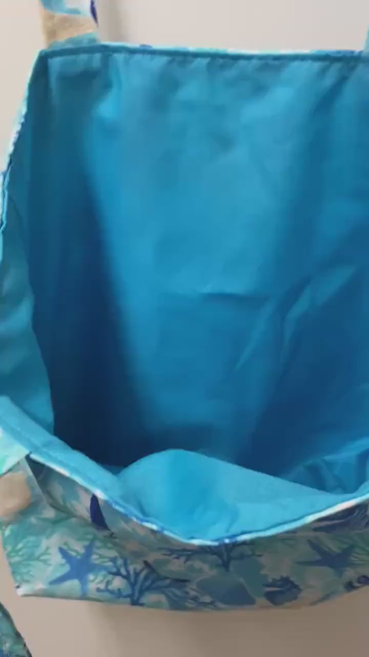 This handmade reversible large tote bag with Seahorses & Seashells with a Blue lining and are perfect to carry around all your favorite things!