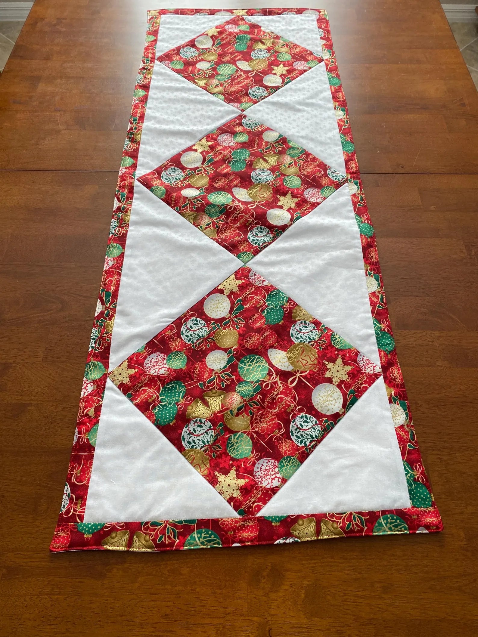 Handmade XMAS Holiday Table Runner Old Fashioned Ornaments. Three triangles with ornaments set with white triangles in between.